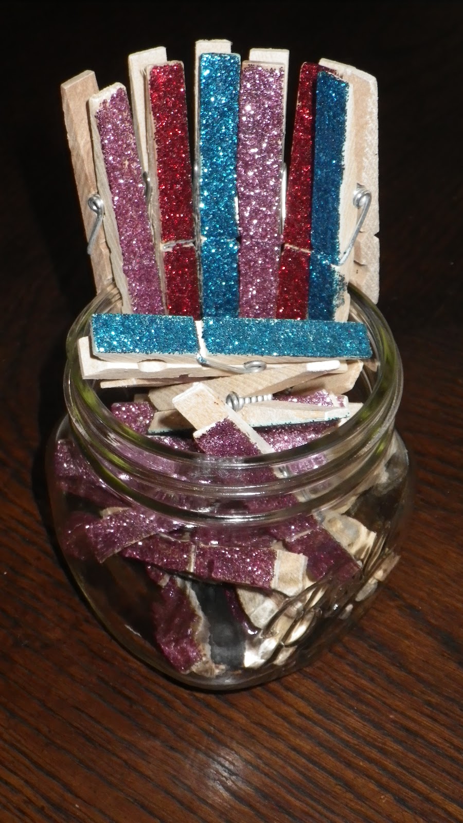 I think the clothespins were a dollar for 25 or 50 at walmart. I already had Mod Podge and glitter.