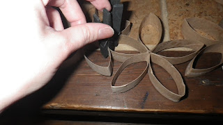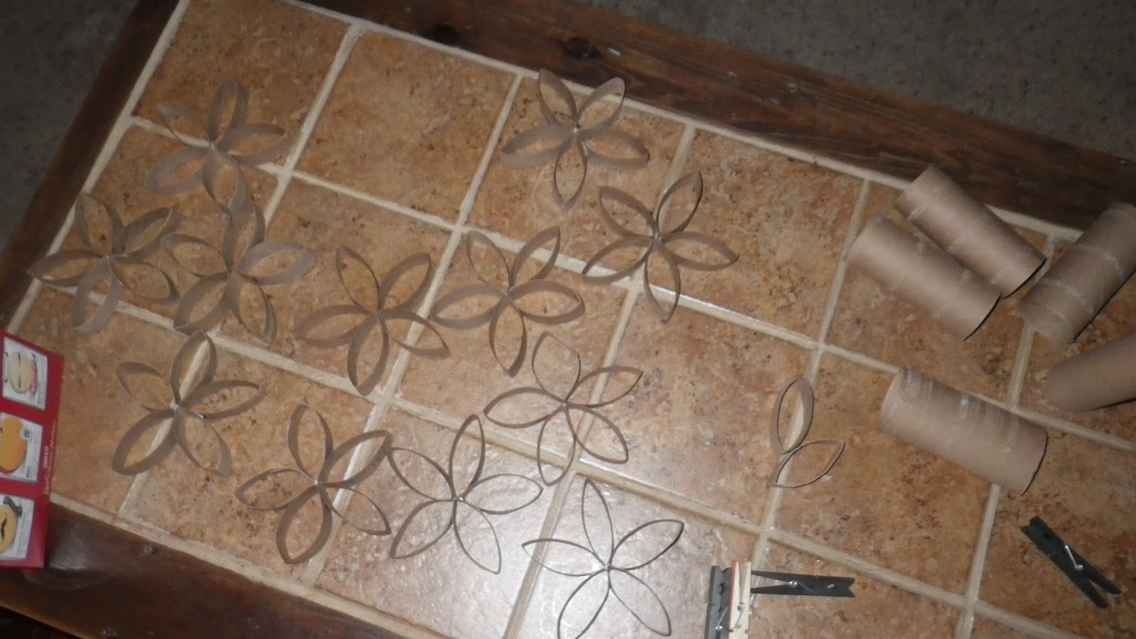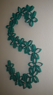 OK- So my mission is to make the letter S out of toilet paper rolls. I really liked the flower designs I have seen on some of the toilet paper roll wreaths on other blogs and decided to use that design to construct my letter! Although I am doing an S, I think any letter would be doable. ** You may find, as I did, that you will need to use some strategery (technical term alert) when hanging your letter-- I used thumbtacks to hang my S and shape it the way I wanted- but more on that later.