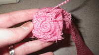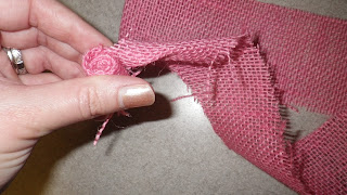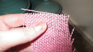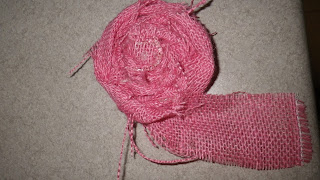 Get your fabric and cut a strip 1 inch wide by 24 inches long. After you make one you can adjust the length and width of fabric to your liking. Most of my strips are about 27 inches-ish. I say ish because I don't really measure things. No self respecting lazy crafter does! In the pictures I am using some pink burlap I bought at Hobby Lobby with a 40% off coupon (Woohoo!).